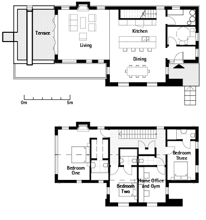 Home office & Gym. Open-plan Kitchen, Living & Dining (KLD) with wood burner fireplace.